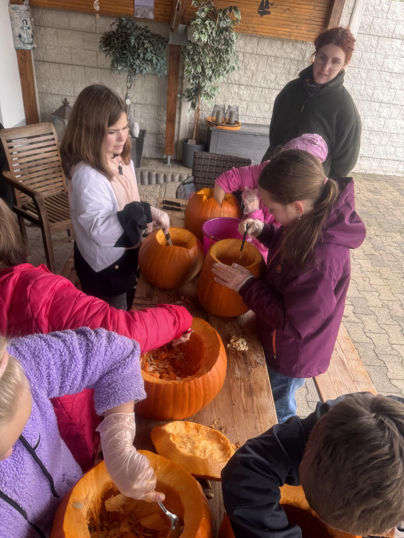 Am Samstag, den 25.10.25, haben wir mit gut gelaunten und entsprechend motivierten Kids Kürbisse geschnitzt. Selbst das nasskalte Herbstwetter konnte den Kids die Laune nicht vermiesen. Vom Regen geschützt unter der Pergola werkelten sie an ihren persönlichen Kürbissen. Die Ergebnisse lassen sich sehen: coole, lustige und schreckliche Gesichter entstanden. Super war es, dass wir zwei Begleitungen hatten, Steffi Mohr und Nadine Wüllenweber. Mit den Beiden ging alles nochmal so schnell. Ein dickes Danke an Euch!!
