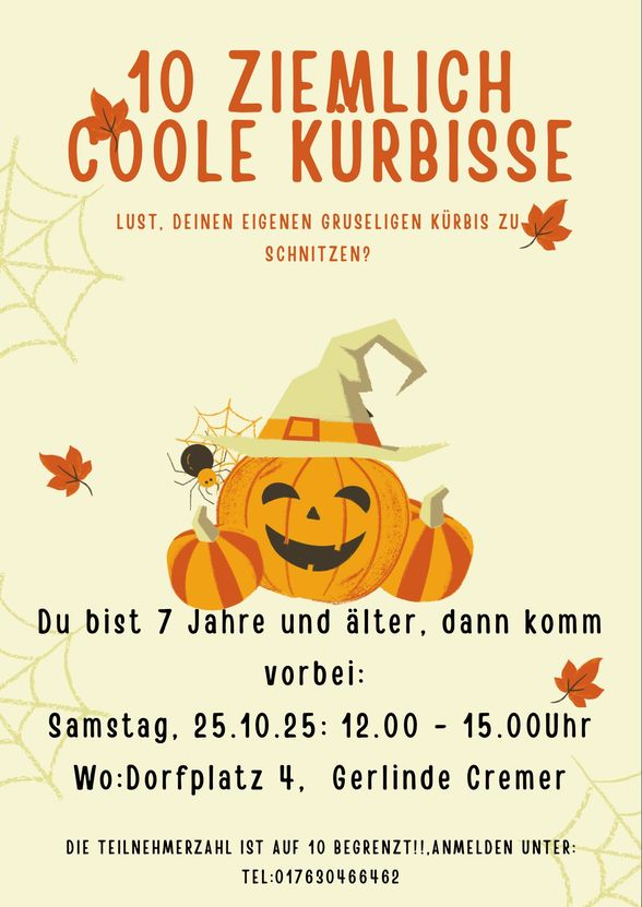 Halloween naht nun schnellen Schrittes und vielleicht möchte noch jemand seinen eigenen, gruseligen oder liebenswerten Kürbis schnitzen. Da die Bürgerhalle bereits Vorbereitungen „Umbau Horrorhaus“ treffen wird, weiche ich mit meinem Angebot in meinem privaten Garten aus. Materialien, Kürbisse und „Werktisch“ stehen für die Teilnehmenden vor Ort bereit. Mitzubringen sind lediglich gute Laune, Arbeitskleidung und Freude an der Arbeit.